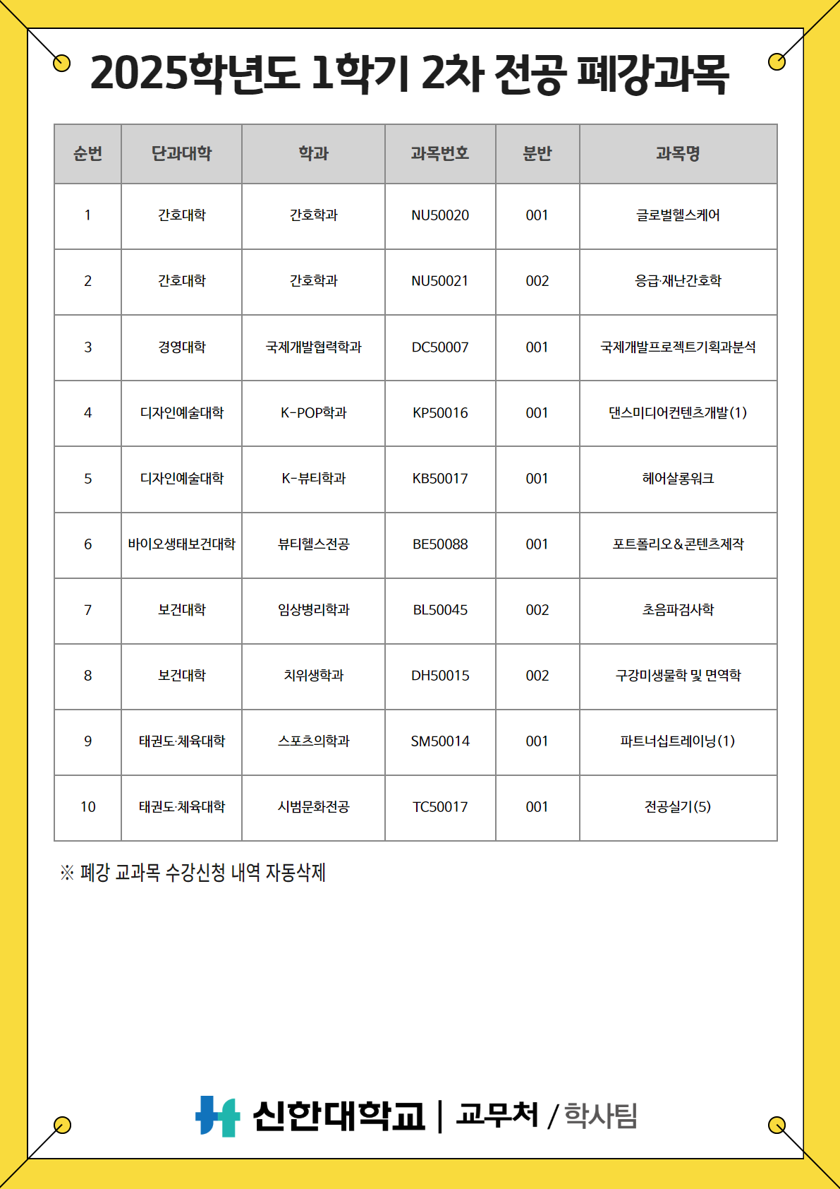 [학사팀/수업] 2025학년도 1학기 전공교과목 2차 폐강 안내