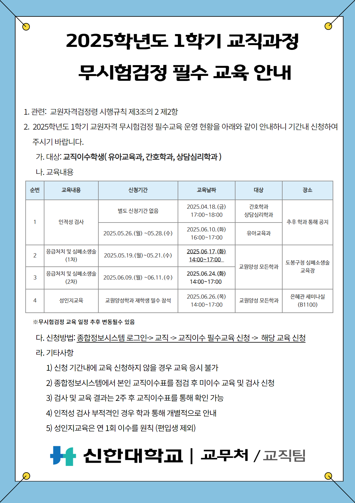 [교직] 2025학년도 1학기 교직과정 무시험검정 필수 교육 안내 (수정)